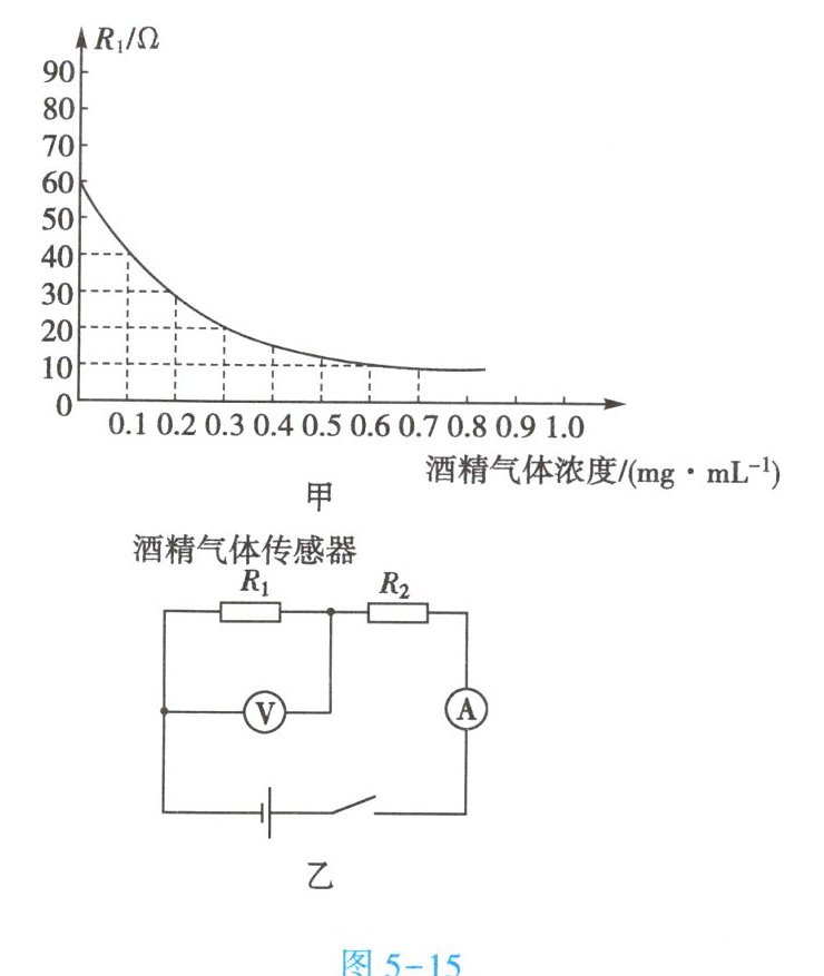 12. (★★★)为了检测驾驶员是否饮酒后驾车,酒精测试仪被广泛应用。有一种由酒精气体传感器制成的呼气酒精测试仪,当接触到的酒精气体浓度增大时其阻值降低,如图5-15甲所示。当酒精气体浓度为0时,$R_1$的阻值为60Ω。如图5-15乙所示的工作电路图中,电源电压恒为8V,定值电阻$R_2= 20Ω$。
