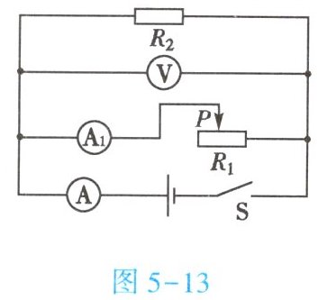 10. (★★★)如图5-13所示,电源电压保持不变,闭合开关$S$后,当滑动变阻器的滑片$P$自中点向左端移动时,电压表$V$的示数将