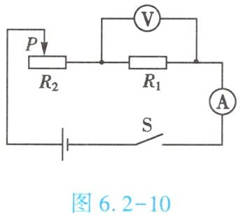 5. (★★★)(双选)如图 6.2 - 10 所示,电源电压保持 6 V 不变,电流表的测量范围为 0~0.6 A,电压表的测量范围为 0~3 V,定值电阻 $ R_1 $ 的规格为“10 Ω 0.5 A”,滑动变阻器 $ R_2 $ 的规格为“20 Ω 1 A”。闭合开关 $ S $,为了保证电路安全,在滑动变阻器的滑片 $ P $ 移动的过程中,下列说法正确的是【
