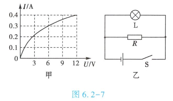 6. (★★★)如图 6.2 - 7 甲所示是通过灯泡 L 的电流跟其两端电压关系的图像。现将 L 与阻值为 10 Ω 的电阻 $ R $ 连入如图 6.2 - 7 乙所示的电路图中。闭合开关 $ S $,L 的实际功率为 1.8 W,则电源电压是