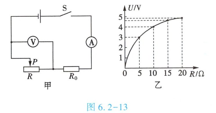 8. (★★★)如图 6.2 - 13 甲所示的电路图中,电源电压不变,$ R_0 $ 为定值电阻,$ R $ 为滑动变阻器。闭合开关 $ S $,滑片 $ P $ 从一端移到另一端的过程中,电压表的示数随滑动变阻器连入电路的阻值变化的关系如图 6.2 - 13 乙所示。下列说法正确的是【