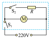 在项目化学习中,科技小组的同学给旧电吹风加装两根塑料管改装成湿鞋烘干器,如图 6.2 - 14 甲所示,可实现冷风吹干和热风烘干两种功能。其内部电路是由一个发热电阻( )、一个电动机( )和两个开关组成的并联电路。发热电阻正常工作时的电功率为 440 W,且不能单独工作出现“干烧”现象。请你帮助他们解决下列问题: