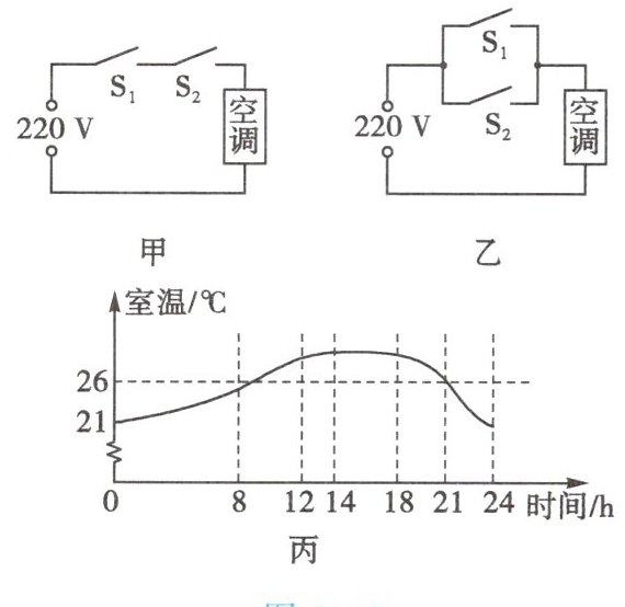 (填“甲”或“乙”)。已知小明家某天室内温度变化情况如图6-10丙所示,当天8:00~12:00和14:00~18:00家中没有人,其他时间家中有人,空调的额定电压是220V,额定功率是1kW,则这台空调当天消耗的电能是5