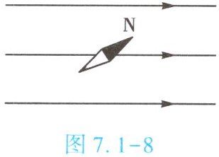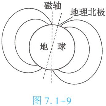 在图7.1-9中,地磁场的磁感线方向应从地理南极附近(地磁北极)指向地理北极附近(地磁南极)。在图中的磁感线实线上用箭头标出方向,箭头从磁轴的南(地理北极附近内)向北(地理北极附近外)及对应磁感线方向标出即可。
