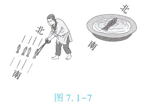 7. (★★)人类最早的磁化技术出现在我国宋代。据《武经总要》记载,如图7.1-7所示,古人先将鱼形铁烧红,令铁鱼头尾指向南北,然后将其放入水中冷却,依靠地磁场获得磁性,再将其放入水中漂浮,制成指南鱼,图中是它静止时的指向。下列判断正确的是【