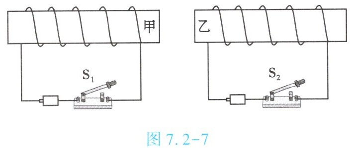 4. (★★)如图 7.2 - 7 所示,甲、乙为两个靠得很近的螺线管,开关 $ S_1 $、$ S_2 $ 同时闭合,通电后的两个螺线管相互作用的情况是【