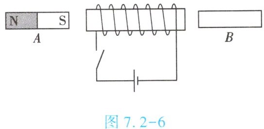 3. (★★)如图 7.2 - 6 所示,将条形磁体 A 放在通电螺线管的左侧,右侧放软铁棒 B,闭合开关,观察到的现象是【