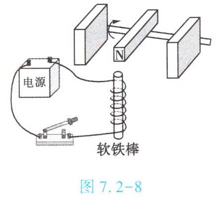 5. (★★)如图 7.2 - 8 所示是一种电磁仪表的部分装置,闭合开关后,磁铁 N 极向上转动(箭头所示),则通电线圈上端为