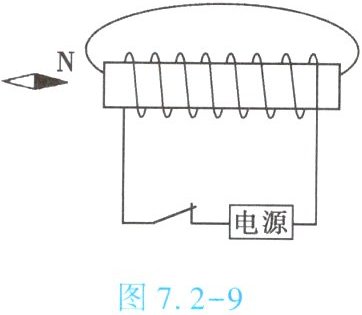 6. (★★)如图 7.2 - 9 所示,根据闭合开关后小磁针 N 极静止时的指向,标出电源的正极,并用箭头标出磁感线的方向。