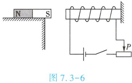 4. (★★)如图 7.3 - 6 所示,条形磁体置于水平桌面上,电磁铁水平放置且右端固定。当滑动变阻器的滑片 $ P $ 逐渐向右移动时,条形磁体仍保持静止,在此过程中,条形磁体受到的摩擦力的方向和大小变化分别是【