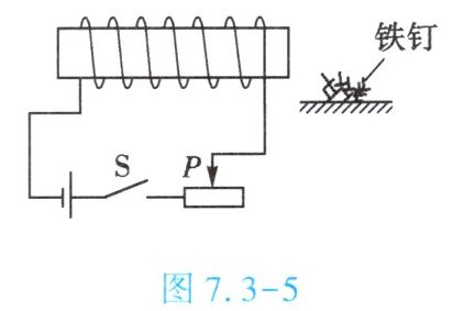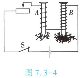3. (★★)如图 7.3 - 5 所示,用漆包线(导线表面涂有绝缘漆)绕在纸筒上做成了一个螺线管,用来探究通电螺线管的磁性强弱与哪些因素有关。闭合开关 $ S $ 后,发现通电螺线管能够吸引一些铁钉。下列能使它吸引更多铁钉的办法是【