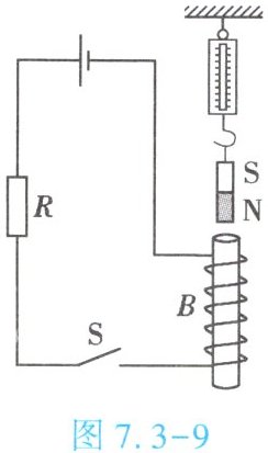7. (★★)(双选)如图 7.3 - 9 所示,电源电压不变,$ R $ 为定值电阻,弹簧测力计下端挂一条形磁体,且与螺线管 $ B $ 在同一竖直线上。将开关 $ S $ 闭合,条形磁体静止时,弹簧测力计的示数为 $ F $,则【