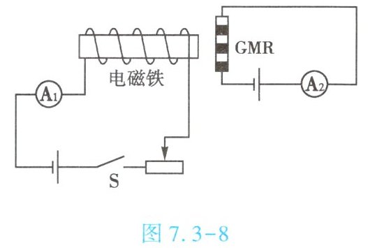 6. (★★)巨磁电阻($ GMR $)在磁场中,电阻会随着磁场的增大而急剧减小,用 $ GMR $ 组成的电路图如图 7.3 - 8 所示,开关 $ S $ 断开,电流表 $ A_{2} $ 有示数,电源电压恒定,则【