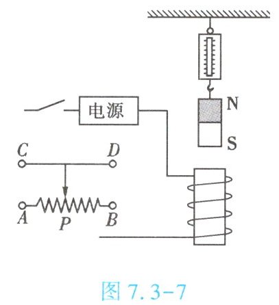 5. (★★)(双选)如图 7.3 - 7 所示,弹簧测力计下吊一条形磁体,闭合开关后,弹簧测力计的示数减小。当滑动变阻器的滑片 $ P $ 向右移动时,弹簧测力计的示数进一步减小,则电源的极性和滑动变阻器应接入的接线柱是【