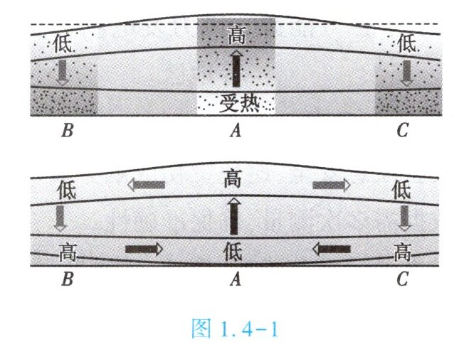 分布不均匀而产生的。图 1.4 - 1 所示是热力环流示意图,当 A 地受热时,近地面空气会上升