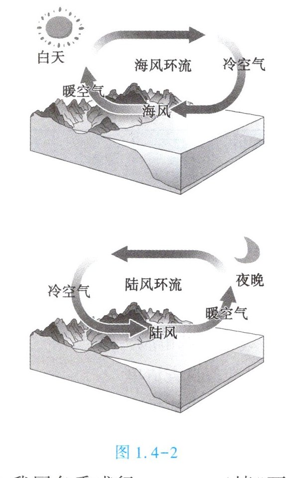海水的比热容。根据图 1.4 - 2 可知,白天的海陆风风向是从海洋