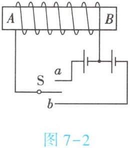 首先发现了电流周围存在着磁场,第一个揭示了电和磁之间的联系。小郭同学自制了一个用开关来控制电磁铁南、北极的巧妙装置,如图7-2所示。当开关S接a