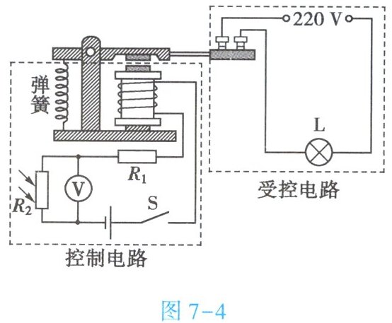 5. (★★★)(双选)如图7-4所示是一款智能照明灯的电路,灯L天暗时自动发光,天亮时自动熄灭。控制电路中,电源电压恒定$,R_1$为定值电阻$,R_2$为光敏电阻,其阻值随光照强度而变化。下列说法正确的是【