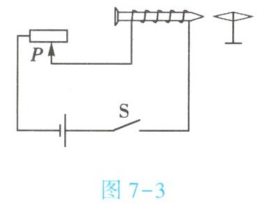 4. (★★)小华同学用导线绕在铁钉上,接入如图7-3所示的电路中,制成了一个