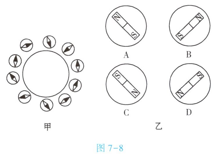 6. (★★)在一个圆纸盒里放一个条形磁体,盒子周围放了一些小磁针(小磁针涂黑端为N极),这些小磁针静止时的指向如图7-8甲所示。在图7-8乙中画出了盒子内条形磁体放置的大概位置,并标出了N、S极,其中正确的是【