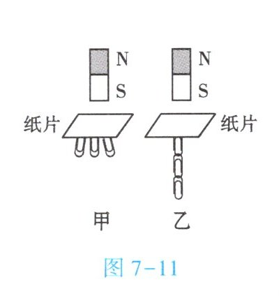 (1)如图7-10所示,保持磁体和纸片间的距离一定。在纸片上放不同物体时,通过比较纸片下面能吸附的回形针数量,显示磁体对回形针吸引力的大小。回形针的放置有图7-11中的甲、乙两种方法,依据