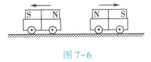 3. (★★)如图7-6所示,将载有条形磁体的两辆小车同时由静止释放后,两辆小车将迅速分离。此现象说明:(只需写出两条)