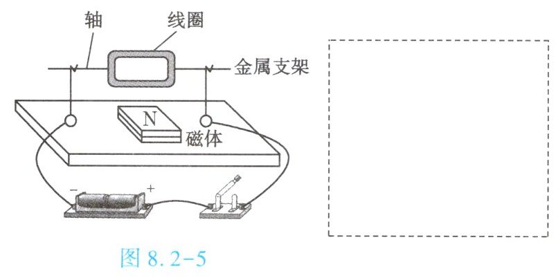 7. (★★★)为了探究电动机为什么会转动,小明根据电动机的主要构造制作了一台简易电动机,如图8.2 - 5所示。他用回形针做成两个支架,分别与电池的两极相连,用漆包线绕一个矩形线圈,以线圈引线为轴,并用小刀刮去轴的一端的全部漆皮,另一端只刮去半周漆皮,将线圈放在金属支架上,磁体放在线圈下方,闭合开关,用手轻推一下线圈,线圈就会不停地转动起来。