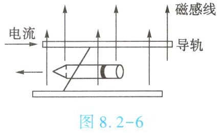 电磁炮是一种利用电磁发射技术制成的装置,具有速度快、命中率高、威力大、无火药污染等优点。它的主要原理如图8.2 - 6所示,通电导体在磁场力的作用下沿导轨加速运动,系在通电导体上的弹体以极高的速度(可达10 km/s)发射出去。电磁炮的发射过程是能量转化的过程,广泛应用于军事领域,未来还可能用于航天发射等领域。