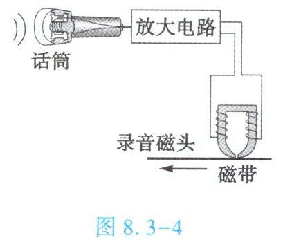 2. (★★★)如图 8.3 - 4 所示是磁带录音机录音原理的示意图。录音时,动圈式话筒将声信号转换为电信号送到录音磁头;录音磁头是一个蹄形电磁铁,它的磁性强弱随电信号变化,将电信号转化为磁信号;录音磁带贴着录音磁头移动,上面的磁粉被磁化,声音信号被记录在磁带上。关于磁带录音机录音的过程,下列说法正确的是【