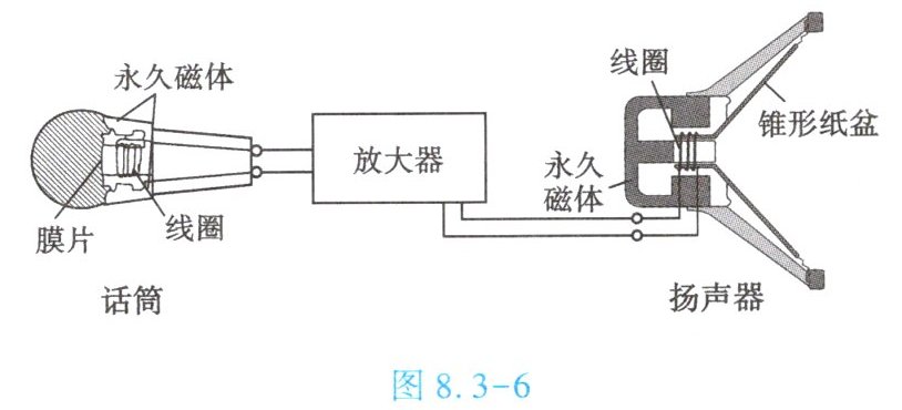 4. (★★)如图 8.3 - 6 所示是动圈式话筒(麦克风)和扬声器(喇叭)的构造示意图。当人对着话筒讲话时,产生的声音使膜片以及与之相连的线圈一起振动,线圈在磁场中的这种运动,能产生随着声音变化的电流;变化的电流经放大器放大后,又通过扬声器的线圈,由于通过线圈中的电流是交变电流,通电线圈就在磁场中来回振动,带动锥形纸盆也来回振动,扬声器就发出声音。