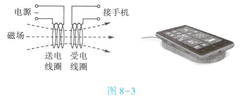 4. (★★)手机无线充电方便了人们的生活,其中电磁感应无线充电是应用最多的无线充电方案。如图8-3所示,它的原理是送电线圈通过一定频率的交流电,线圈的周围形成交变的磁场,通过电磁感应在受电线圈中产生一定的感应电流,从而将能量从发射端转移到接收端。下列选项中和受电线圈工作原理相同的是(