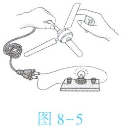 3. (★★)在如图8-5所示的小实验中,用手快速拨动风扇叶片,带动转子转动,这时发现小灯泡发光,微风电扇居然变成了“发电机”,该实验说明了磁能够产生