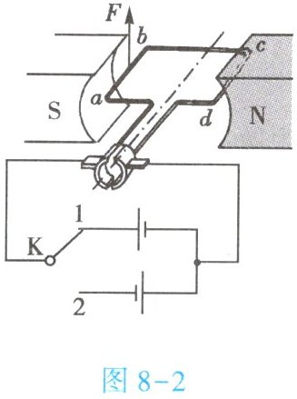 3. (★★)如图8-2所示,线圈abcd位于磁场中,K与1接通时,ab段导线受磁场力F的方向向上;当K改为与2接通时,ab段导线受磁场力
