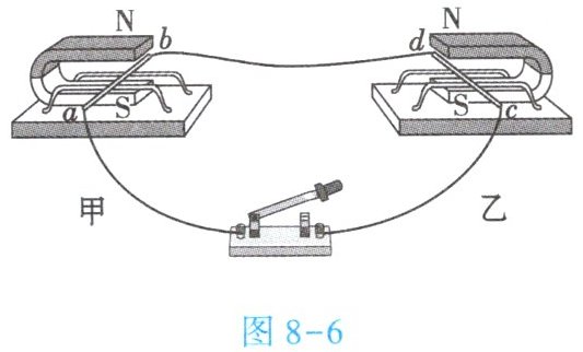 5. (★★★)如图8-6所示,用绝缘细线悬挂着的导体棒ab、cd分别放在磁体中,将它们用导线连接,闭合开关,使导体棒ab在磁体中沿