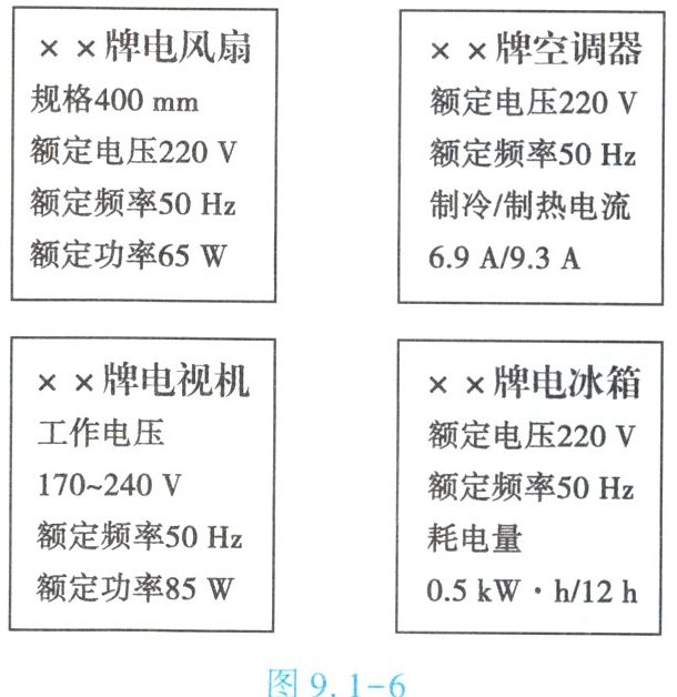 2. (★★★)学校综合实践活动小组的同学收集了图9.1 - 6所示的四种家庭常用电器的铭牌。请根据铭牌中给出的信息判断,下列说法正确的是【