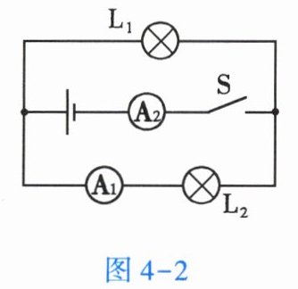2. 在如图4-2所示的电路图中,电流表$A_1$的示数为0.2 A,电流表$A_2$的示数为0.8 A,则通过灯泡$L_1$的电流为