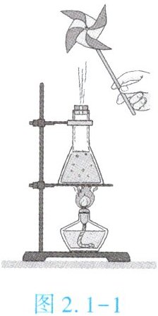 1. (★★)如图 2.1 - 1 所示,在锥形瓶内装些水,用带小孔的胶塞塞住瓶口,在小孔上方放一个用纸做成的小叶轮。加热锥形瓶使水沸腾后,进行观察。