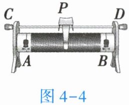 4. 实验室中有一铭牌上标有“20 Ω 2 A”字样的滑动变阻器,如图4-4所示。将它连入电路,移动滑片P,可以改变连入电路中的电阻值,此滑动变阻器是通过改变连入电路中的