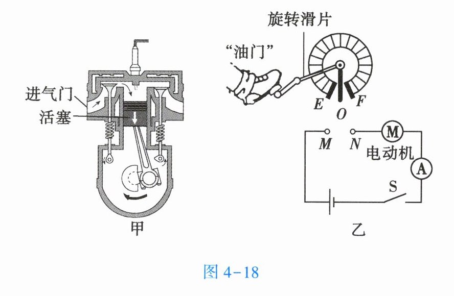 。(2)如图4-18乙所示,O、E、F为旋钮变阻器的三个接线柱,驾驶员踩下“油门”时,旋钮变阻器连入电路中的电阻减小,电路中的电流变大,从而加大电动机的转速。请用笔画线代替导线,将旋钮变阻器接入电路M、N处。