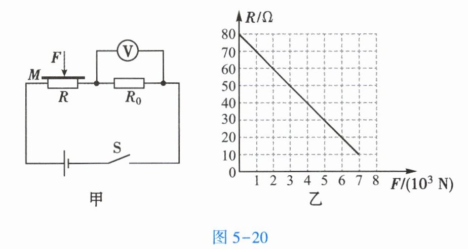 21. 某物理实践小组设计了一种工程上的压力测量装置,其原理如图5-20甲所示,电路中电源电压恒为6 V,定值电阻R₀的阻值为20 Ω,电压表的测量范围为0~3 V,轻质绝缘的压力检测板M与可变电阻R相连,R的阻值与压力F的关系如图5-20乙所示,闭合开关S后,试问: