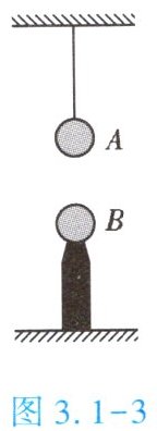 5. (★★)如图 3.1 - 3 所示,用绝缘细线将一重 5 N、带负电的 A 球悬挂在天花板上,把不带电的 B 球接触 A 球后放在 A 球正下方的绝缘柱上。A、B 两球因带电而互相