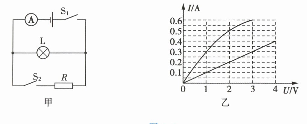 5. 如图6-3甲所示,灯泡L和电阻R并联在电路中,当闭合$S_1$时,灯泡L的实际功率为1 W;灯泡L和电阻R的I-U图像如图6-3乙所示。由此可知,电源电压为