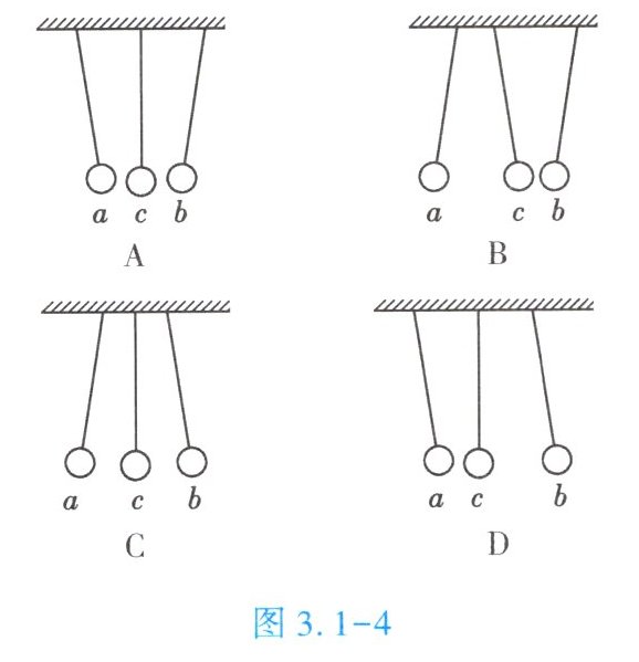8. (★★★)假如自然界存在第三种电荷,且遵循已有的电荷间的作用规律。a、b、c 三个轻质小球分别带正电荷、负电荷和第三种电荷,三个小球均用绝缘细线竖直悬挂,相互靠近但始终不接触,三个小球的最终状态可能为图 3.1 - 4 中的【