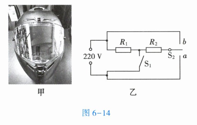 21. 智能防眼镜起雾头盔(如图6-14甲所示)利用温度传感器和湿度传感器控制加热挡位来改变内部眼镜罩的温度,从而防止眼镜起雾。如图6-14乙所示是其电路图$,R_1$和$R_2$是两个定值电阻,该电路通过开关$S_1$和$S_2$的不同接法组合,实现“高温挡、中温挡、低温挡”三种加热功能。当开关$S_1$断开、$S_2$接a时,电路的电功率为5 W;开关$S_1$闭合、$S_2$接a时,电路的电功率为25 W。