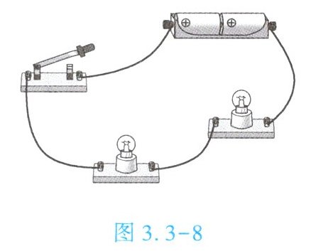 5. (★★★)如图 3.3 - 8 所示,小明把两只灯泡串联接入电路来探究串联电路的特点。