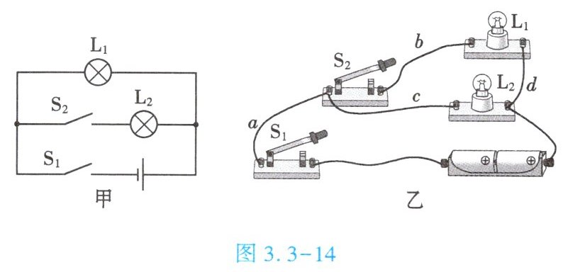 状态;小蓝连接的电路如图 3.3 - 14 乙所示,导线 $ a $、$ b $、$ c $、$ d $ 中有一根接错了,错误导线是b