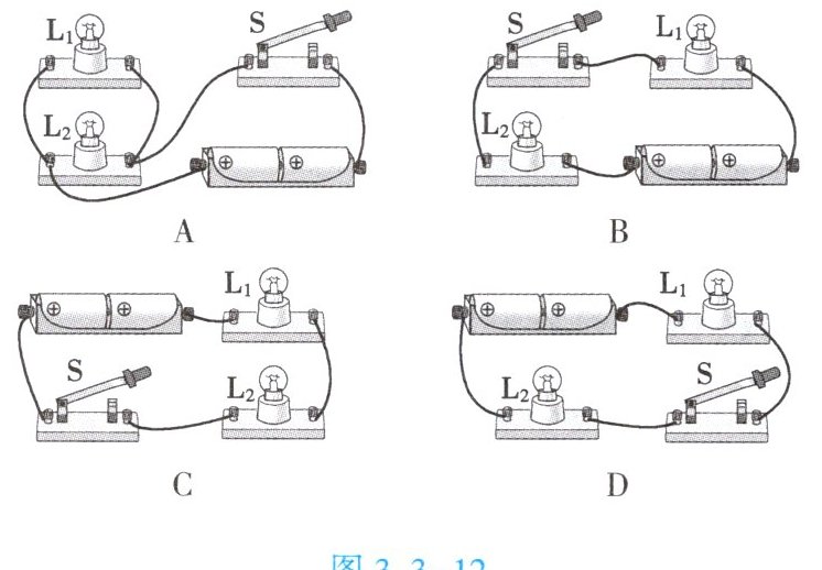 9. (★★★)如图 3.3 - 12 所示,闭合开关 $ S $,小灯泡 $ L_1 $、$ L_2 $ 并联的是【