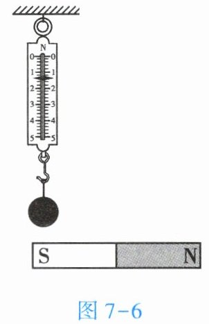 12. 如图7-6所示,弹簧测力计下吊着一个小铁球,小铁球正下方水平放置一个条形磁体,小铁球与磁体左端对齐。将条形磁体水平向左缓慢移动至右端与小铁球对齐。在这个过程中,小铁球始终处于条形磁体的正上方,则弹簧测力计的示数变化情况是【