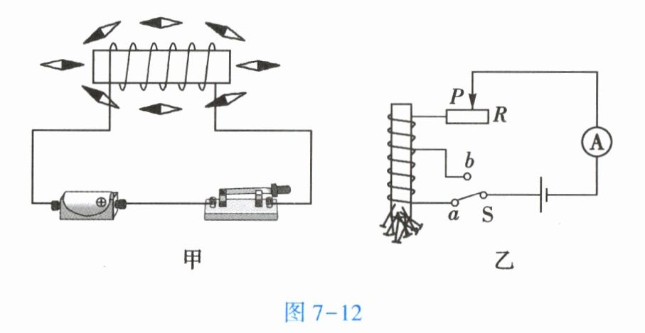 (1)如图7-12甲所示,小明闭合开关,观察到磁针发生偏转,说明通电螺线管周围存在