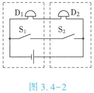 9. (★★★)小亮和小刚是同班同学,又是住在同一家属楼上下层的邻居,经常一起去上学。为了相约方便,小亮想连接一个能够相互呼叫对方的电路,只要一方按下自己书桌上的开关,对方书桌上的电铃就会响,如图 3.4 - 2 所示是他设计的电路。小刚认为这个电路图不符合要求,请写出小刚改进的办法: